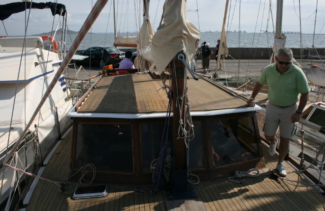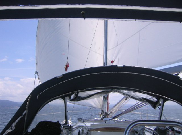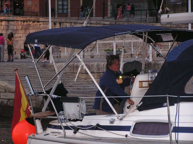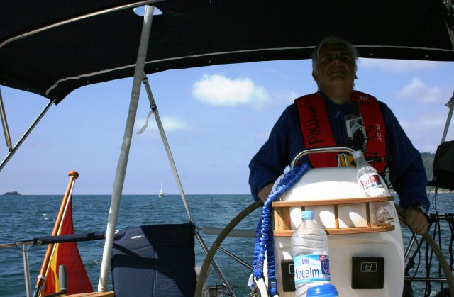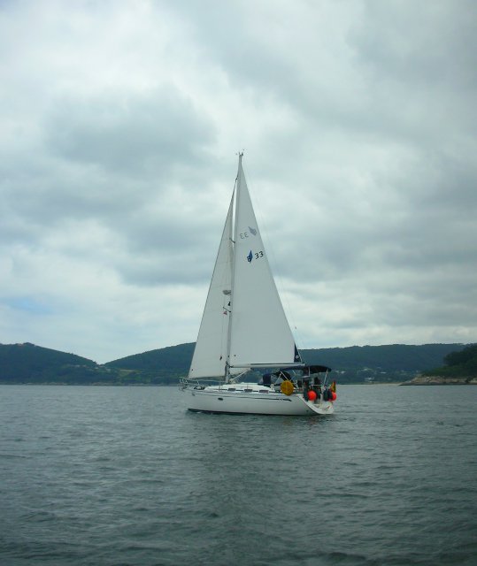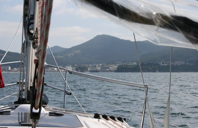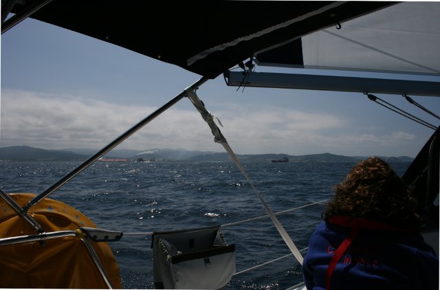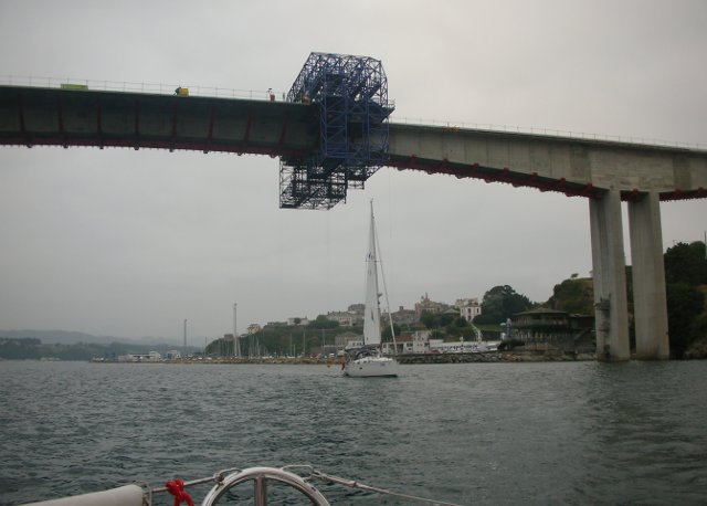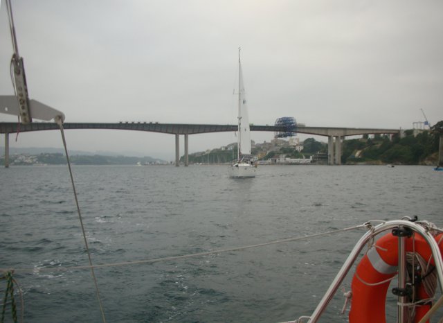 La verdad es que no íbamos tan mal. Solo con mayor y rizada no hemos tenido ningún susto hasta que he visto que la contra iba suelta en su unión con el palo. Hemos cogido un destornillador y a servido para sujetarla contra a la botavara y llegar hasta Sada. Lo malo ha sido cuando hemos intentado meter la mayor enrollable y el cabo sin fin que guarda y saca la mayor se nos ha soltado y era imposible enrollarla en el palo. Hemos encendido el motor y poco a poco hemos ido hasta Punta Candelaria, eso si dando la vela con los obenques y haciendo unos ruidos que parecía que se iba a rajar. En Punta Candelaria ha ido Rafa hasta el palo y ha metido el cabo, cosa que ha demostrado se hace en apenas 5 segundos. Ya desde allí pusimos bien la mayor y sacamos el génova y nos dirigimos a Ferrol. Recorrido turístico hasta la ciudad y de ahí hasta Sada. La travesía nos ha gustado porque nos ha demostrado que el barco aguanta y Rafa también.
