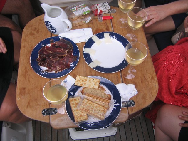 Viernes 1 de agosto. Llega la Volta a Galicia a Vivero y con ella llegan algunos amigos del foro La Taberna del Puerto. Conocemos personalmente a Temais y nos enseña su barco. Para los que conocéis Ribadeo es el padre del dueño del Hotel Porcillan. Compramos unos litrillos de ribeiro por si teníamos sed (13 litros) y una garrafa de 3 litros de licor café.