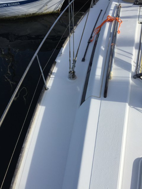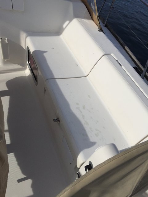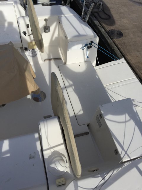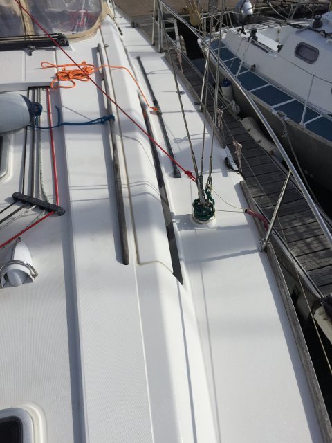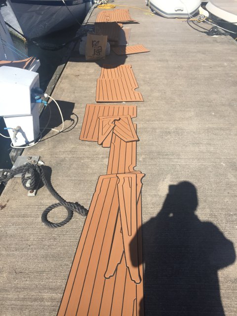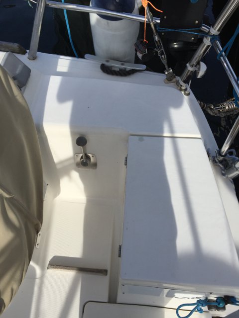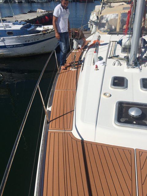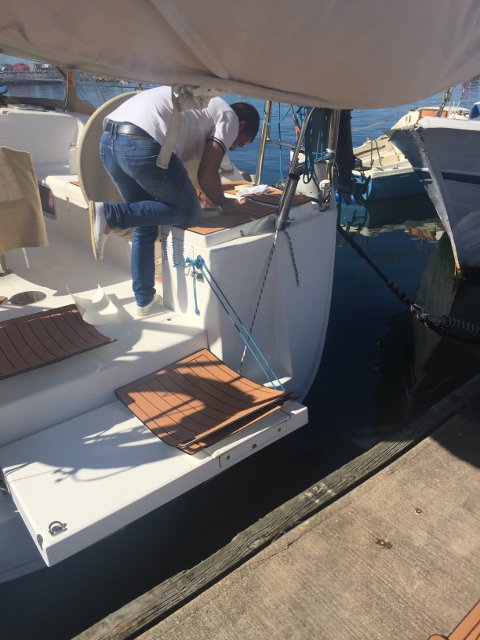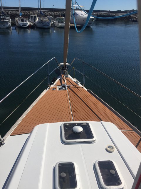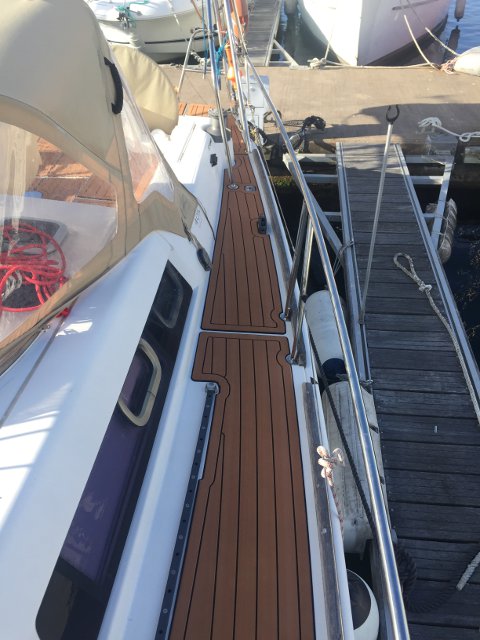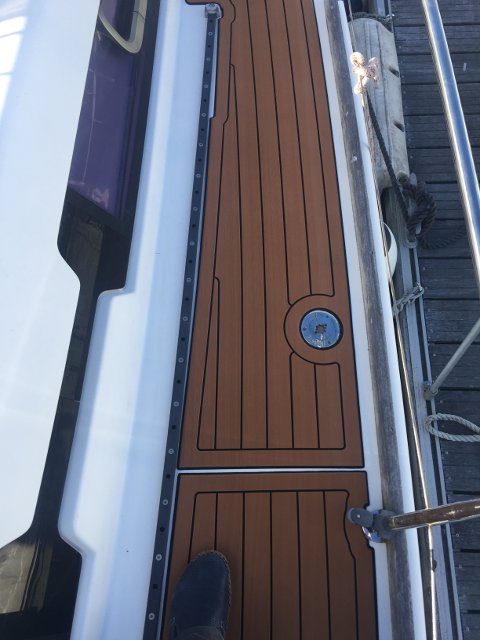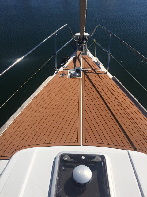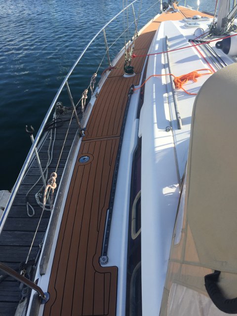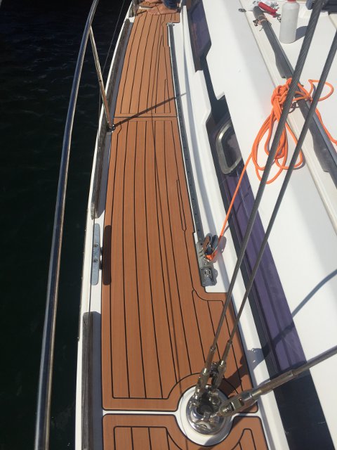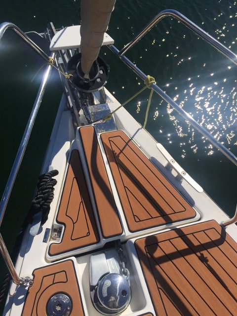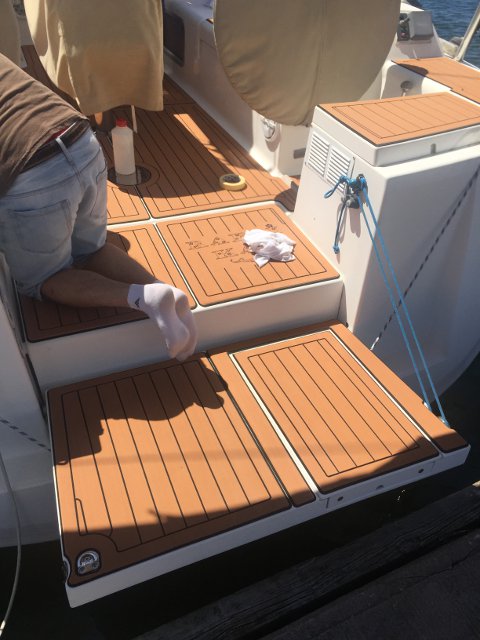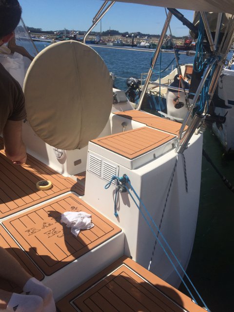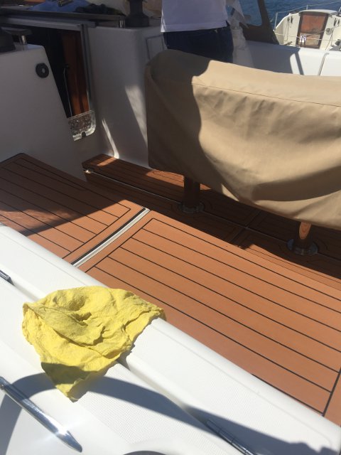 Gracias a Alberto Silva, de Deckmarine, tenemos el suelo de la cubierta y los asientos de la bañera con su producto, que es, básicamente, un polímero termoplástico, antideslizante y que colocado tiene una visión similar a la teca, aunque sintética y de fácil limpieza.