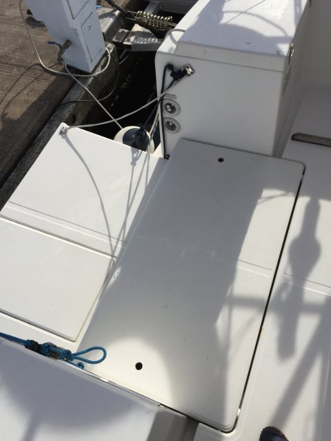 Al volver al agua, colocamos la mesa de la bañera, recién barnizada y con 2 asas de inox nuevas para ayudar a sujetarse cuando vamos navegando.