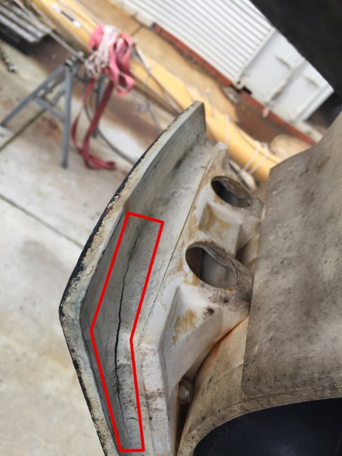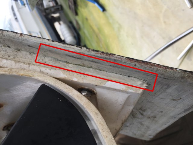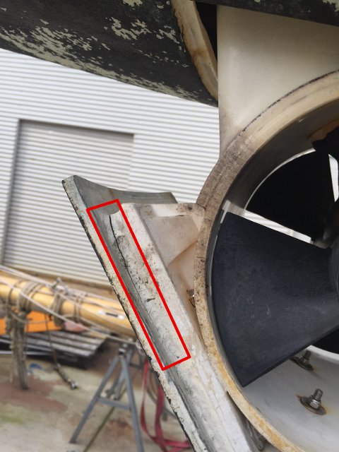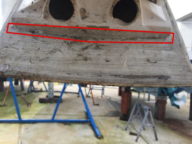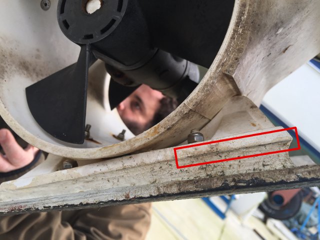 TAPA DE LA HÉLICE DE PROA. RECUADRADA LA FISURA QUE REPARAMOS EN 2017
