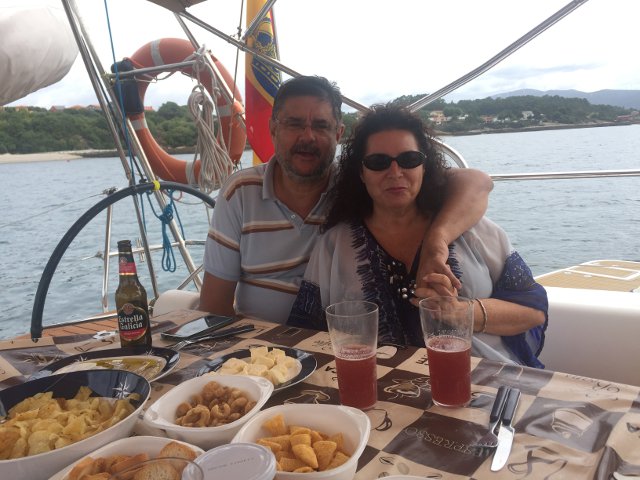 JESÚS Y MARI LUZ DEL GORGO, COMIENDO EN EL RAFNI FRENTE A TANXIL (RIANXO)