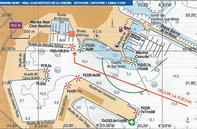 El mar rodea la historia de esta ciudad hecha península por la playa del Orzán. En su callejero destacan las plazas y jardines como la de María Pita y el jardín de San Carlos. Como capital del Antiguo Reino de Galicia supo acoger importantes expediciones marítimas: militares como la Armada Invencible o científicas como la de Alexander Von Humboldt. También sabe recibir a quien dobla el espigón del dique de abrigo y se acoge a aguas del Castillo de San Antón, convertido en museo Arqueológico. O bien enfila su importante puerto comercial que aún mantiene viva la mayor subasta de pescado fresco en la lonja de O Muro. | Procederemos de igual modo teniendo en cuenta el balizamiento: